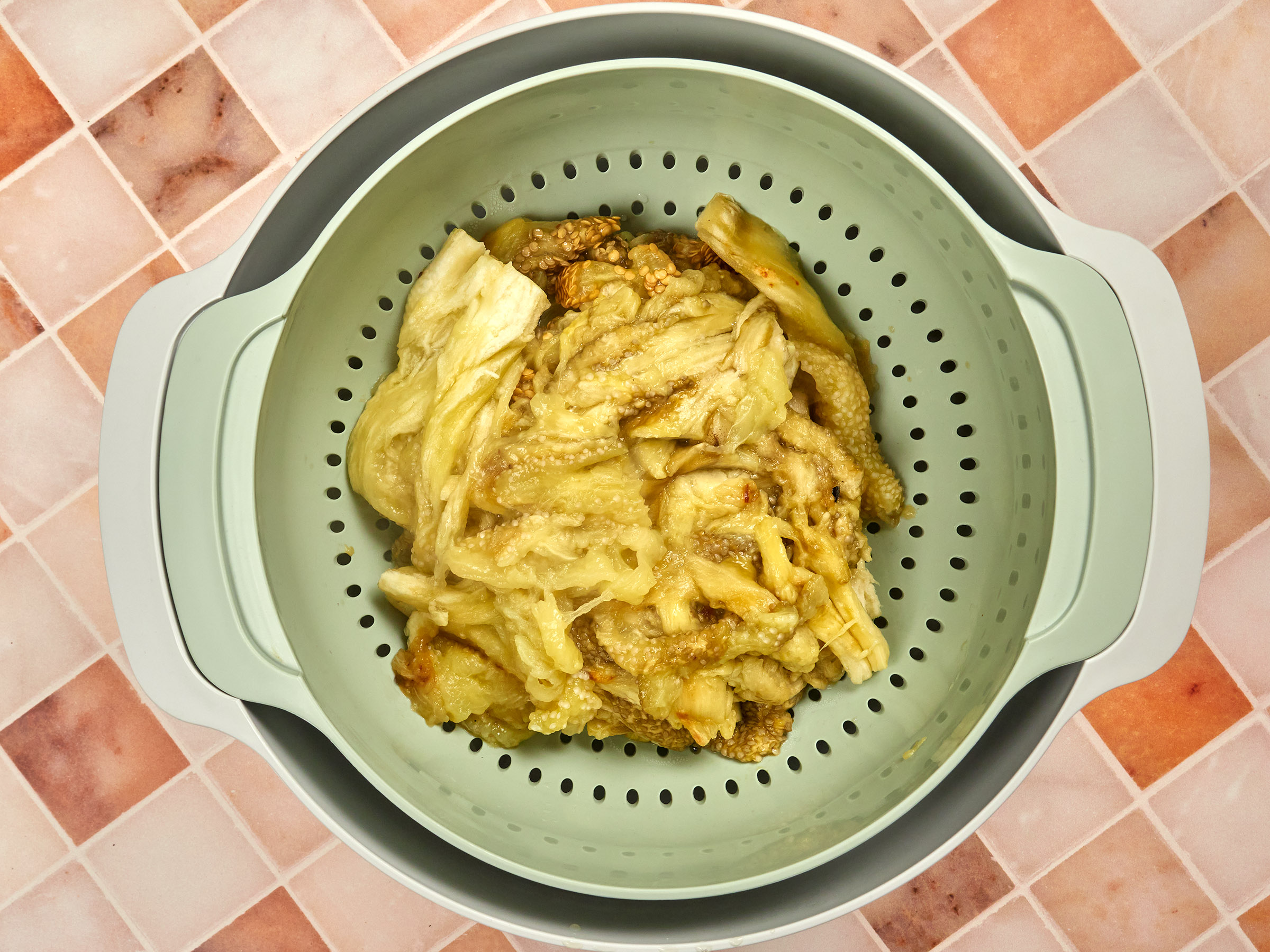 E musai să înțepați vinetele în cîteva locuri cu o furculiță sau cu o frigăruie, altfel vor exploda în air fryer și vor face o mizerie de nedescris în interior (credeți-mă, nu vreți să curățați air fryerul după un episod din ăsta).